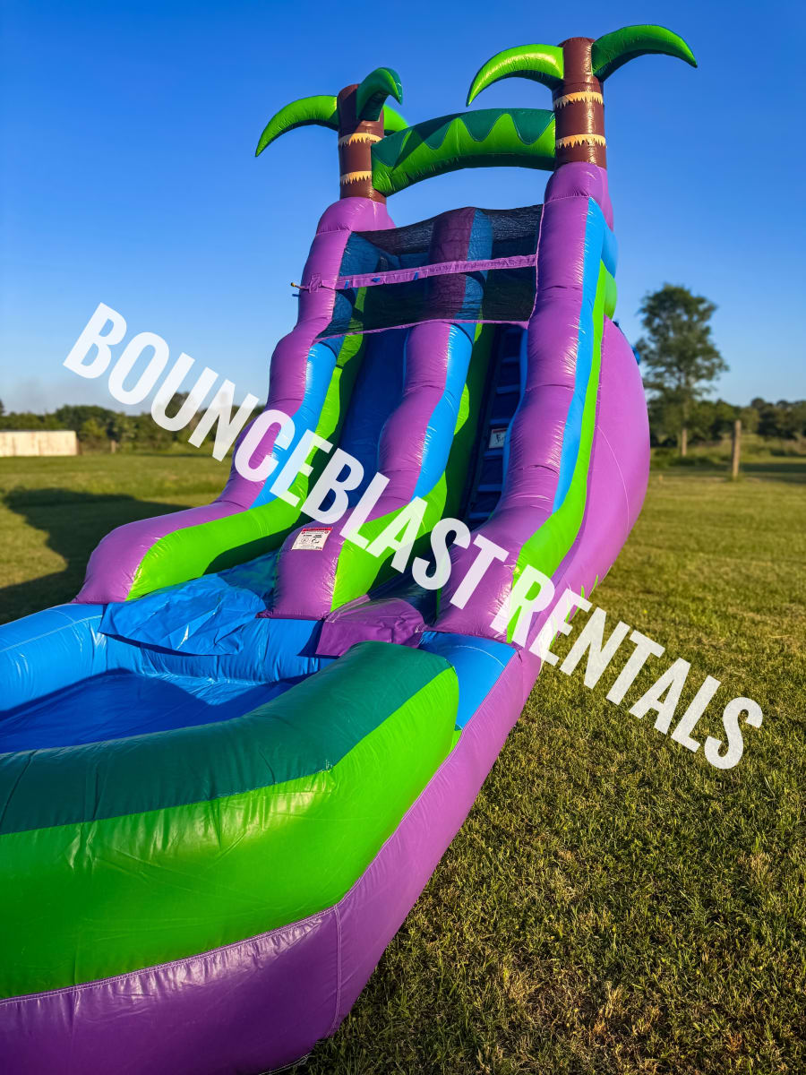 Bring a splash of vibrant color and island adventure to your next party with the PURPLE TROPICAL in delivery areas. This eye-catching inflatable slide is designed to be the centerpiece of any gathering, making it an instant favorite among kids, teens, and even adults! Whether you're planning a backyard birthday bash, a family reunion, or a community event, this tropical-themed slide promises excitement and joy for everyone. 🌴💜